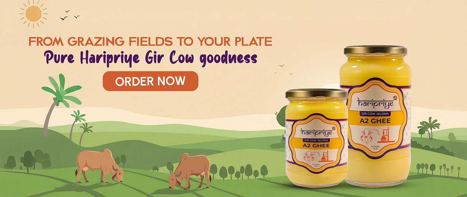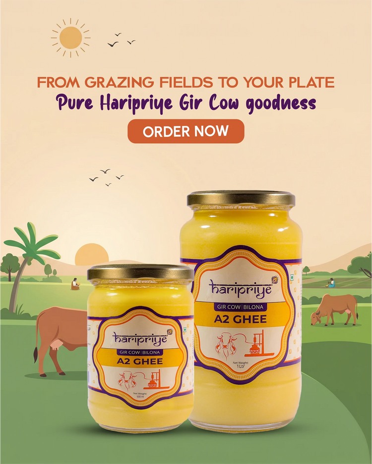 You can buy pure desi cow ghee in India directly from the Haripriye website, or Amazon. Our A2 Gir Cow Ghee is made using A2 milk from desi Gir cows, following traditional methods rooted in Ayurvedic wisdom.