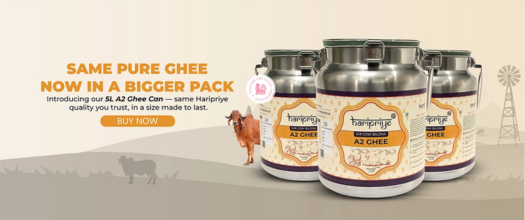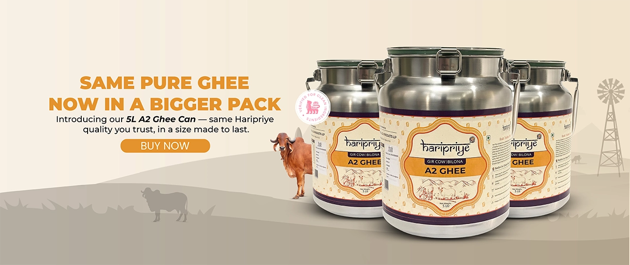 At Haripriye, we create A2 Gir Cow Ghee that enriches both body and soul through traditional methods. Our ghee is inspired by compassion and excellence in practice, ensuring that every drop promises purity and nourishment. Join us in welcoming the wellness that comes from our pure desi cow ghee, crafted with authenticity and the wisdom of generations past. Experience the difference when you buy desi cow ghee online and embrace the health benefits of bilona cow ghee.